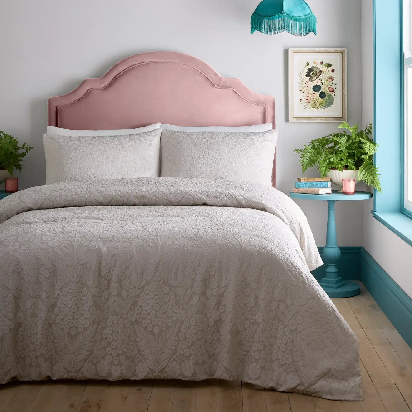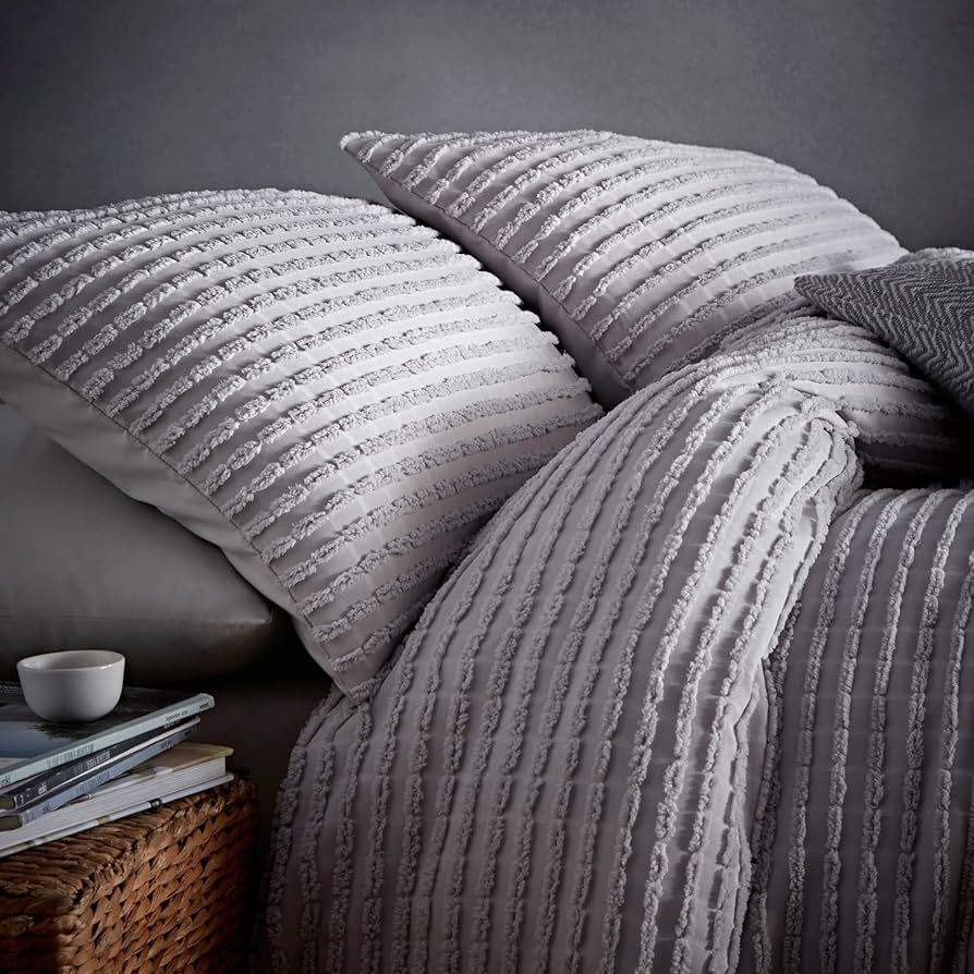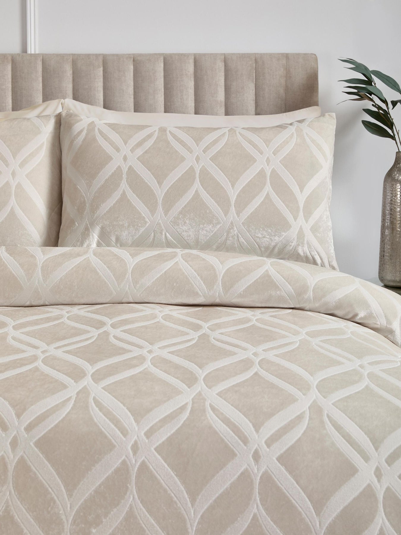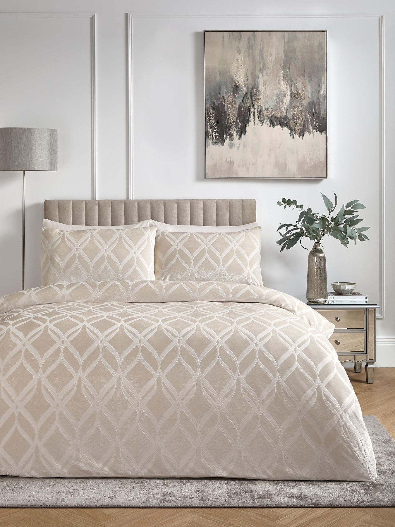 Soiree Mirella Duvet Cover and Pillowcase Set in Double, King and Super King sizes The Mirella duvet cover and pillowcase set by Soiree is a stunning addition to contemporary bedrooms. Crafted from indulgently soft velvet in a deep, dramatic slate tone, the softly shimmering fabric captures the attention with an intricate damask motif running from top to bottom. Carved into the fabric, rather than being simply printed on, it takes on a subtle texture that enhances the sense of depth in your space. A set comprises one duvet cover and two pillowcases in double, king and super king sizes. Material Content: 100% Polyester Washing Instructions: Machine Washable Introducing Soiree, the perfect way to bring a little luxury into your home. Double 200x200cm, King 230x220cm, Super King 260x220cm Includes 2 x pillowcases (76x48cm) Co-ordinating bedspreads also available, see items VNDUH & VNDUI