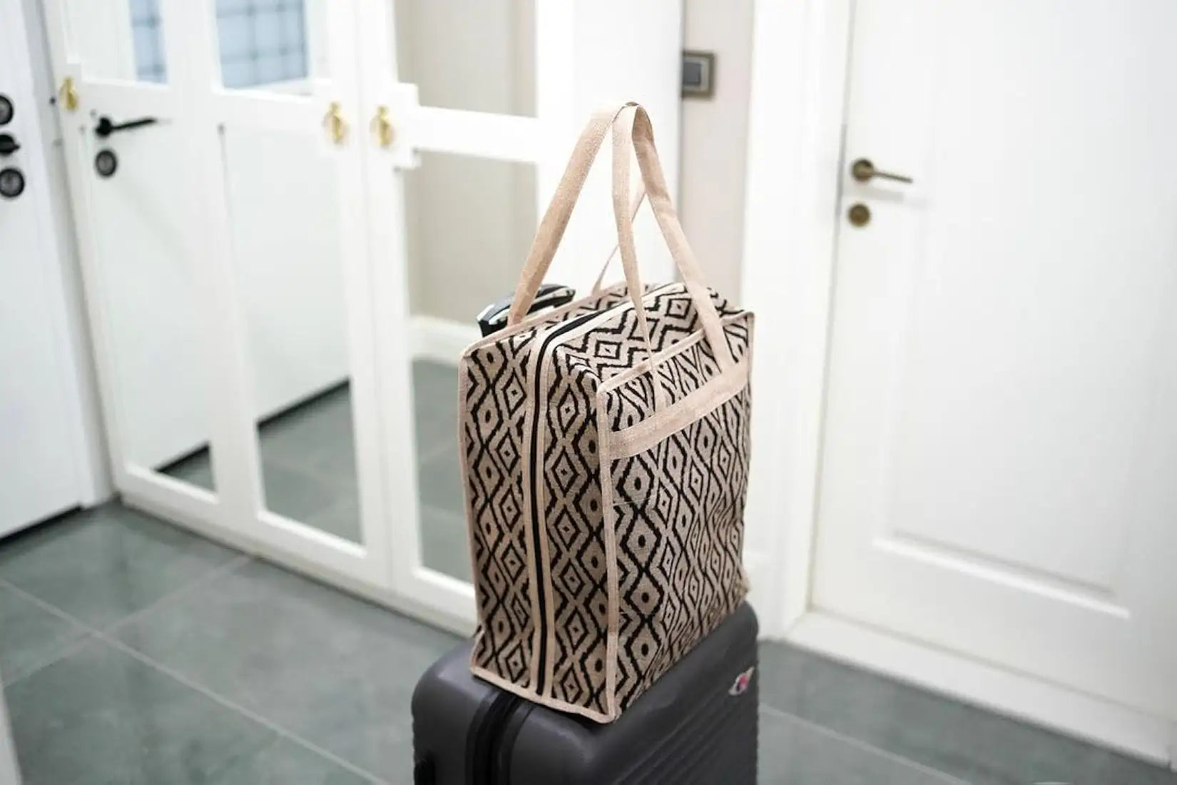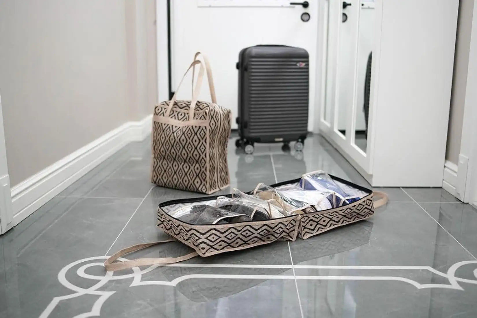 DIFFERENT FROM OTHERS HANGER ON SUITCASE It has a compartment where you can hang it on your suitcase. You will now be able to store your shoes more easily and cleanly during your travels. You will catch the elegance with different pattern and color options.